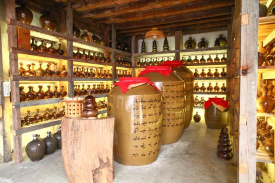 兩年前,到云南德宏州梁河采風(fēng)時,在梁河下面勐養(yǎng)鎮(zhèn)的一個傣族村寨,探訪當(dāng)?shù)匾粦粢恢毖赜么黾覀鹘y(tǒng)釀酒工藝釀造牛屎酒的錢姓人家時,除了感嘆傣家“牛屎酒”的神奇外的第一感覺是:時至今日,居然還有人利用這個“土得掉渣”的陶罐裝酒。