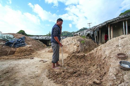 作坊內(nèi)顯得有點雜亂,幾間矮舊的平房,院子里雜草叢生,空地上堆放著幾堆陶土,碼得整齊的木柴,還晾曬著幾個剛完工不久的陶胚。此刻,劉師傅正在翻拌陶土,為下午的工作做準(zhǔn)備。