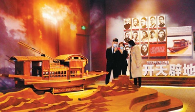 圖為觀眾在博物館參觀中共一大會址嘉興南湖紅船模型。