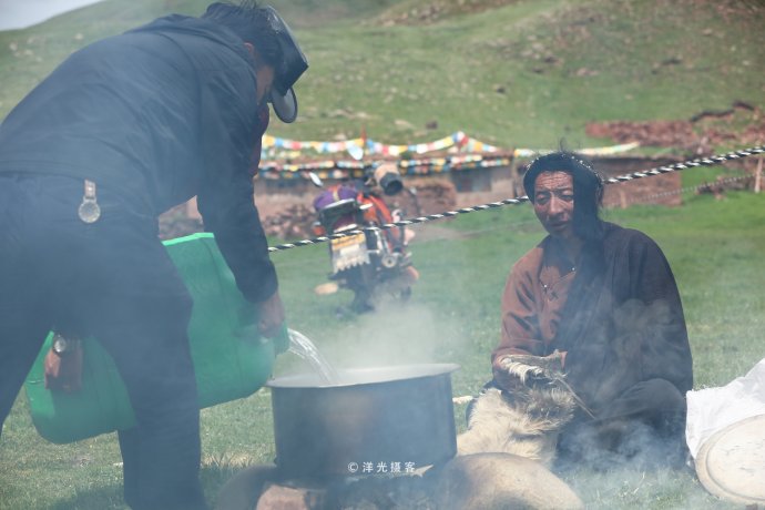 在帳篷外搭起簡單的爐灶,用草原上最原生態(tài)的牛糞干燒水、煮茶、煮牛奶。