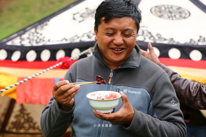 正當(dāng)大家陶醉在歌舞美食中時(shí),主人家卻突然端出一盆食物,只見旁邊的藏族朋友都開心的拍起手來,我也好奇的湊上前去看,這一看,可真把我嚇得:那盆里是血糊糊的一大塊,感覺還未完全凝固的鮮血,還正在冒著熱氣。