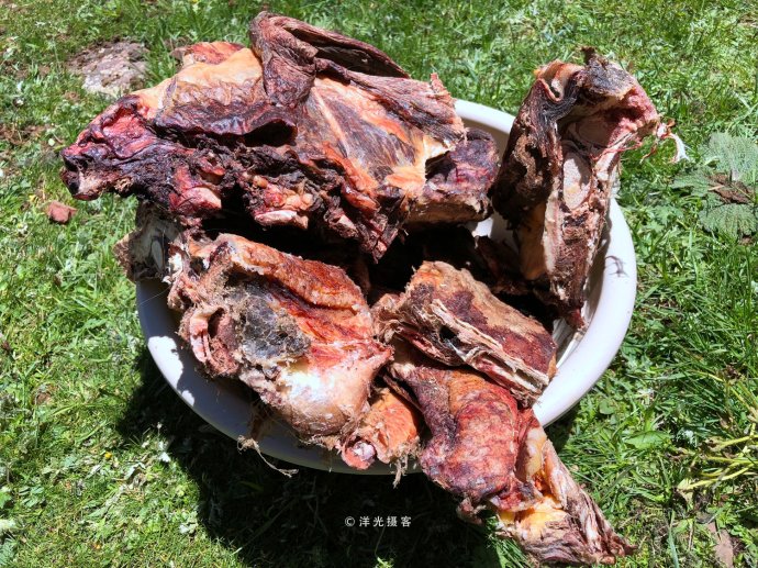 看著主人家麻利的切起來分盤,我直打顫。主人家說這是昨晚剛割下來的牦牛血,和去年的風(fēng)干牛肉和在一起,蒸個(gè)半熟就可以吃了,藏語叫“沒貨”(音譯)。