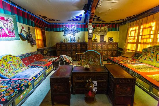 看看帕拉莊主的臥室,十分豪華講究。我們睡覺是睡在一張床上,而藏族人習(xí)慣把長椅當(dāng)做床,睡在上面。歷經(jīng)這么多年,這臥室里的織錦還是色彩鮮艷,要不是注明請勿觸摸,我真想試試是什么樣的手感。