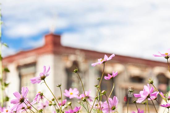 莊園周圍盛開著大片的格桑花。這是一種生長在海拔5000米以上高原上的花朵,象征著愛與吉祥。很多人喜歡格桑花,因?yàn)樗宫F(xiàn)了不屈的堅韌。無論多惡劣的環(huán)境,它們沐浴在高原的陽光下,不畏風(fēng)霜嚴(yán)寒。桃粉色的花朵讓人看了心情大好。