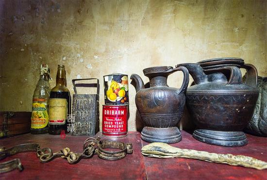 旁邊的梳妝臺各種用品一應(yīng)俱全。想想我自己,都沒有這么一個尺寸正好的梳妝臺,羨慕。柜子里還有帕拉貴族當(dāng)年遺留下來的名貴食品、餐具、進(jìn)口酒、進(jìn)口白醋、珍貴裘皮服飾,生動再現(xiàn)帕拉家族當(dāng)年的豪華生活場景。