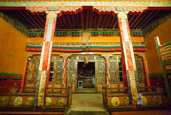 經(jīng)堂是帕拉莊主念經(jīng)或舉行法事活動的地方。陳設(shè)考究,直至今日,經(jīng)書、佛龕都還保存完好。堂內(nèi)雕刻、繪畫、擺設(shè)等多為內(nèi)地樣式,明顯能看出雕金鑲玉的圍欄是典型的漢式風(fēng)格,可見中原文化對其有著較大的影響。