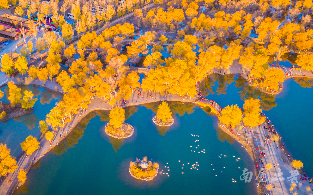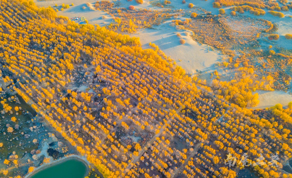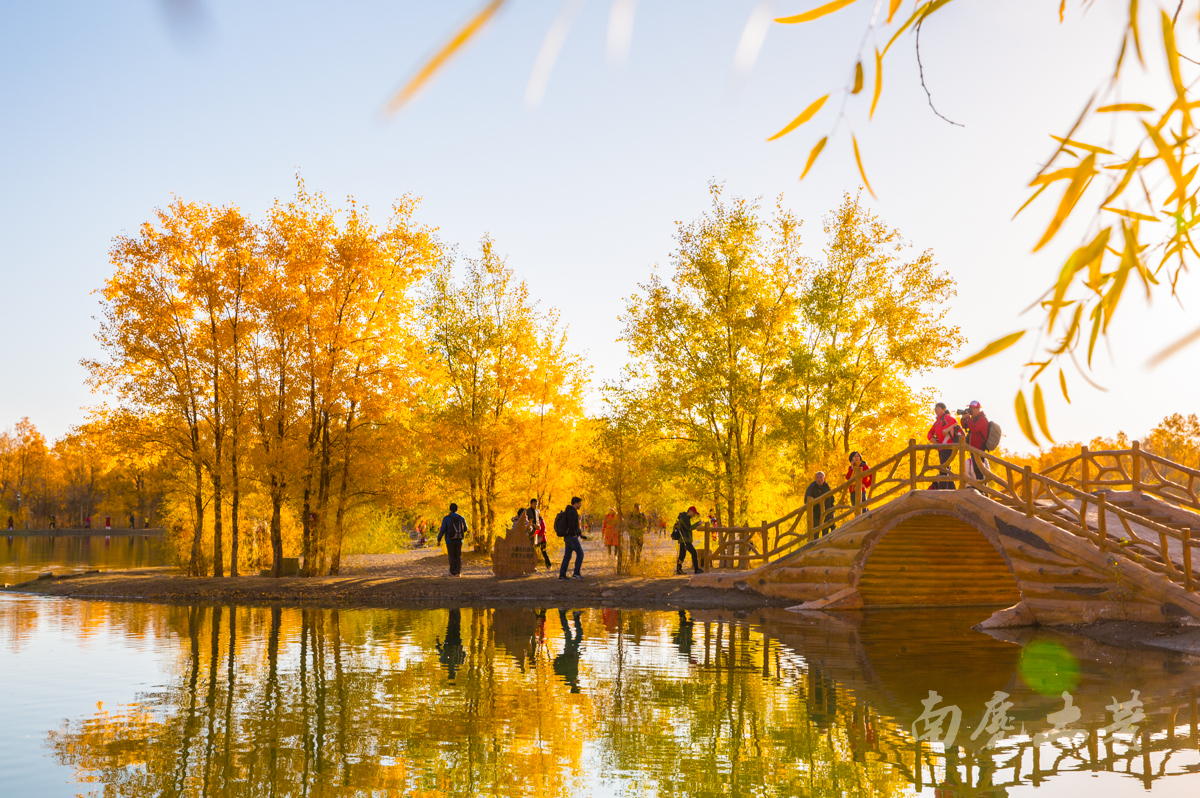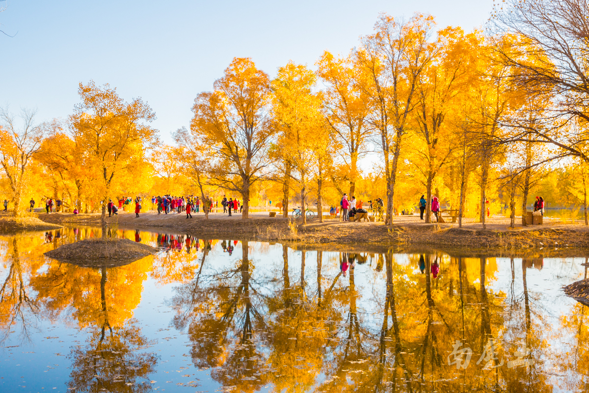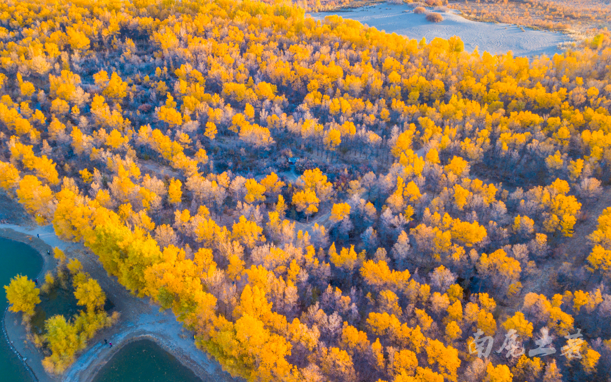 在景區(qū)沿水岸走一圈,胡楊林金碧耀眼,沙棗花清香撲鼻,胡楊金黃的葉片,飄飄灑灑“嘩嘩”地落到柔綿沙灘,大地鋪上了金色的地毯,輝煌而不失爛漫。