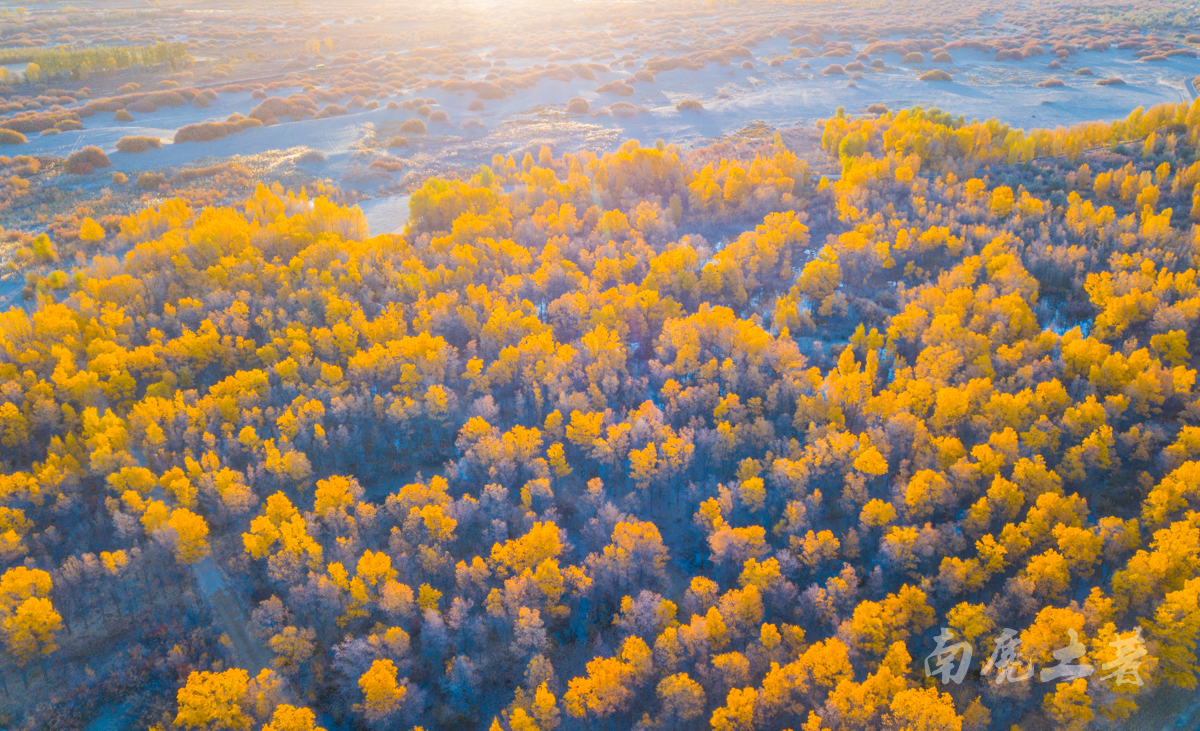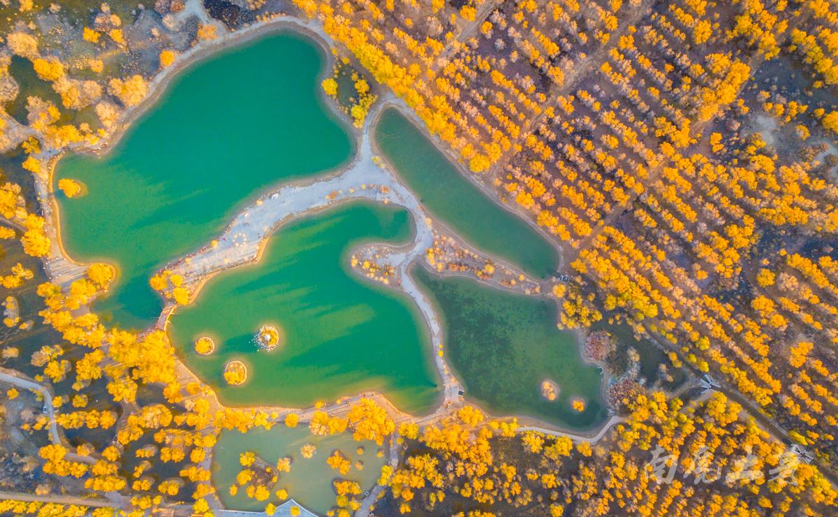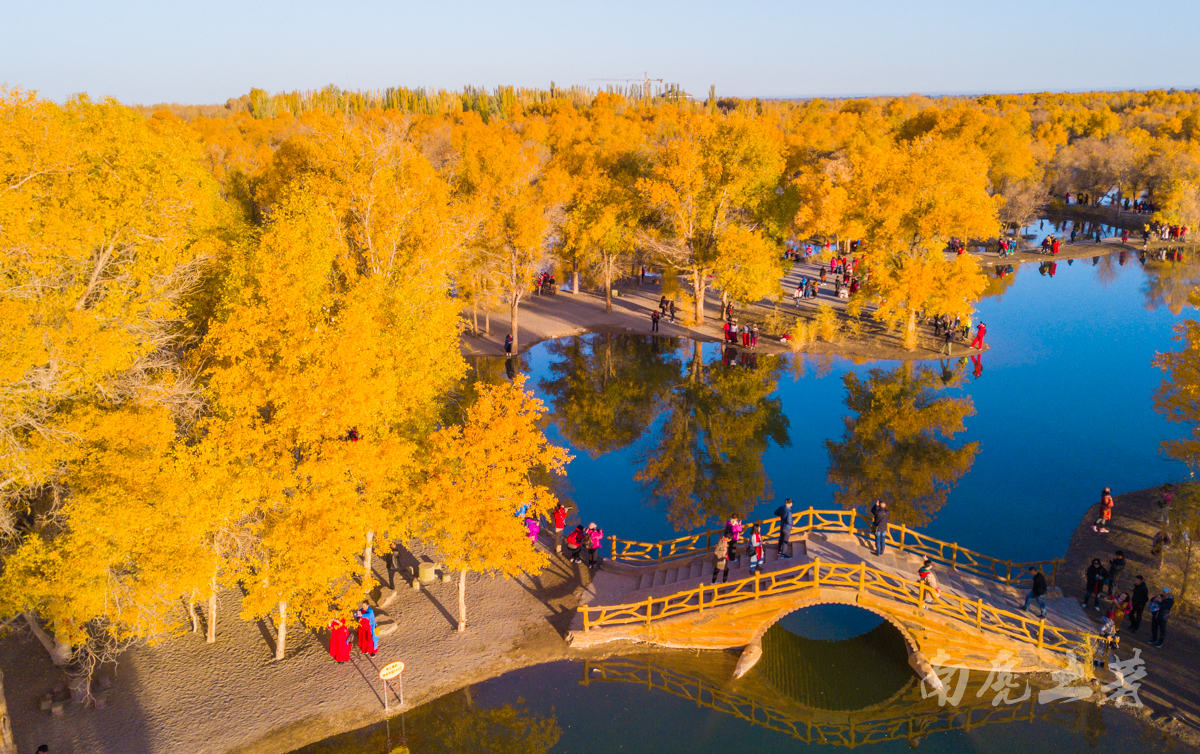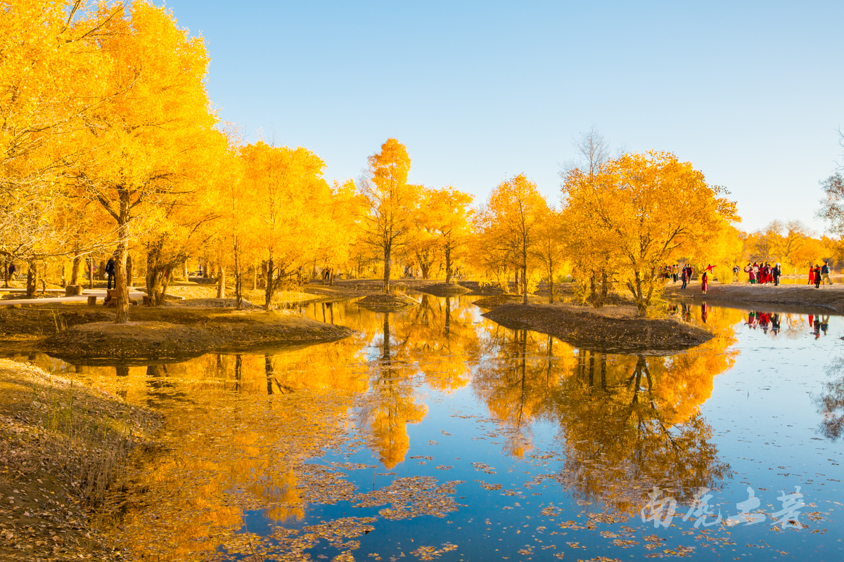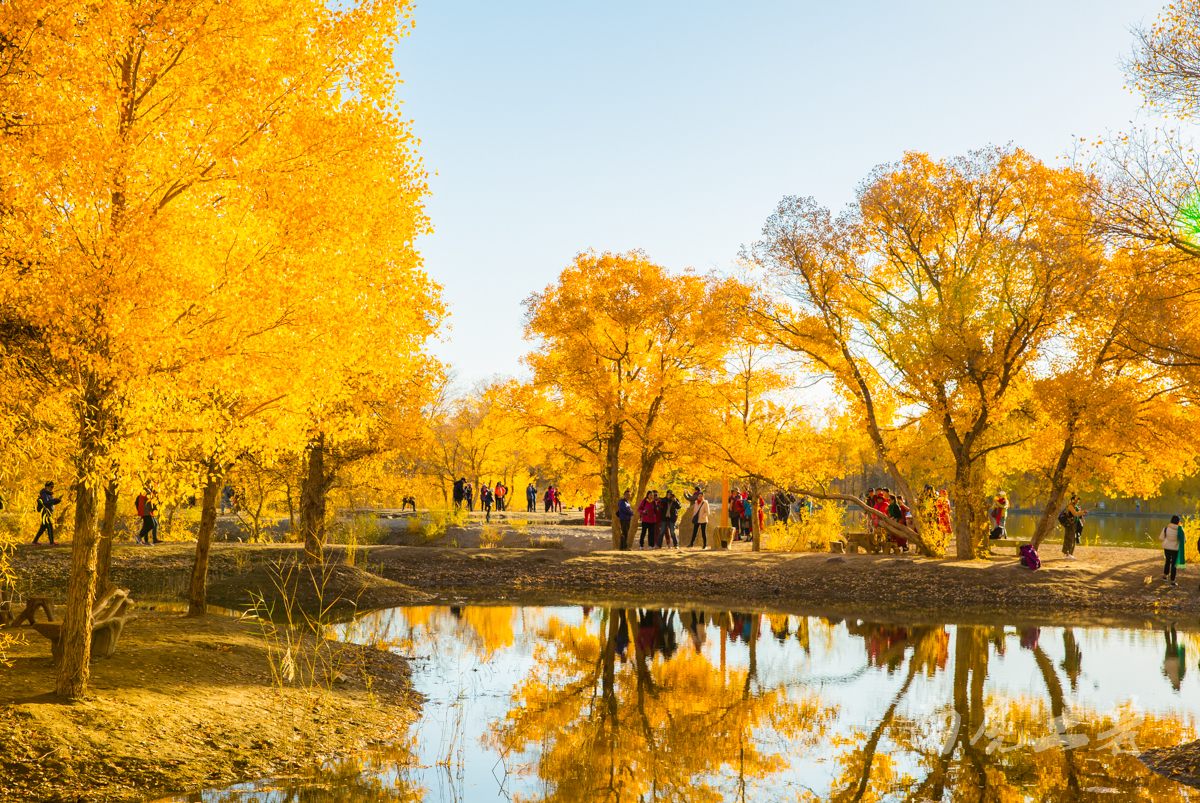在景區(qū)沿水岸走一圈,胡楊林金碧耀眼,沙棗花清香撲鼻,胡楊金黃的葉片,飄飄灑灑“嘩嘩”地落到柔綿沙灘,大地鋪上了金色的地毯,輝煌而不失爛漫。