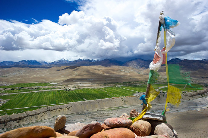 寺院前刻有六字真言的瑪尼石壘成一道矮墻,墻頭懸掛著的五彩經(jīng)幡迎風(fēng)飛舞,山谷里良田萬(wàn)頃,流水潺潺,一派迷人的高山田園風(fēng)光。