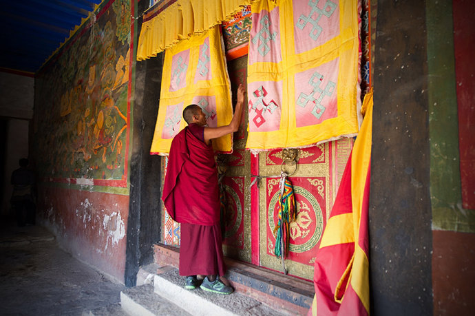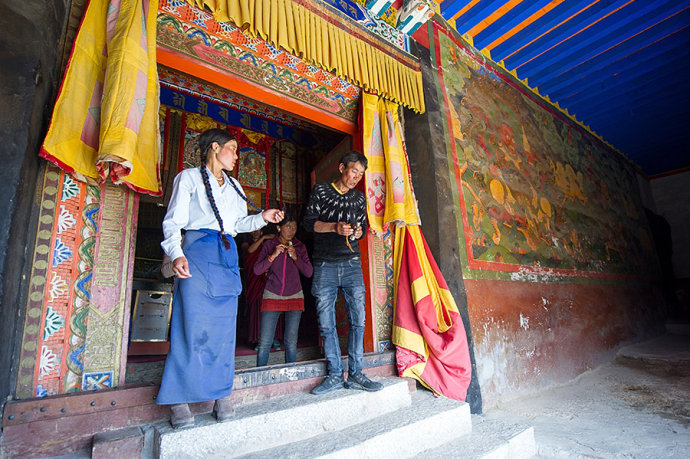 等我們拍完院子準(zhǔn)備進(jìn)入佛殿時(shí),那戶藏族人已經(jīng)朝拜完畢,準(zhǔn)備圍著佛殿轉(zhuǎn)經(jīng)啦。佛殿的墻壁四周,均繪有精美的壁畫。