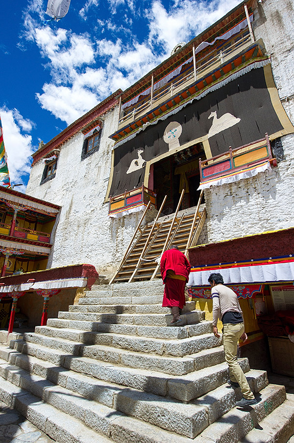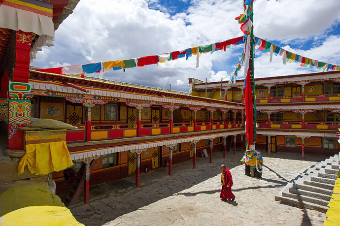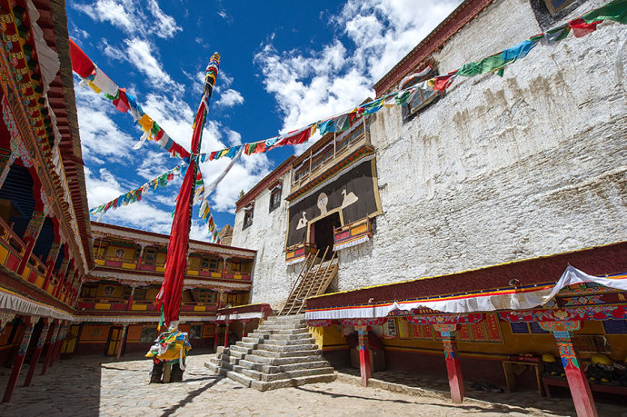 大門內(nèi)的院子,高聳著的經(jīng)幡柱直刺向藍(lán)天,一旁佛殿幾近垂直的墻壁,給人強(qiáng)烈的壓迫感,有種不怒自威的感覺(jué)。