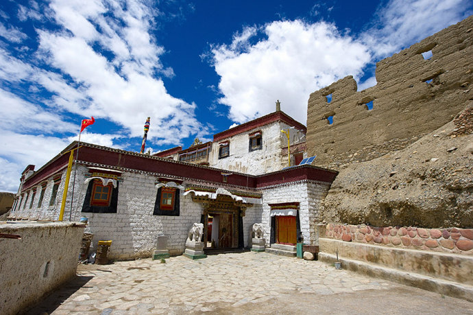 柏林寺是藏語(yǔ)音譯,也有稱其為香柏林寺、夏格巴林寺的,這個(gè)詞在藏語(yǔ)中是“贖罪”的意思,也就是說(shuō)這是一座用來(lái)“贖罪”的寺廟,這又是什么來(lái)由呢?如果說(shuō)之前介紹的孔雀王朝是歷史學(xué)家的推測(cè),并無(wú)史料可考的話,那這座用來(lái)“贖罪”的寺廟,可是有確切歷史記載的。十七世紀(jì)時(shí),拉達(dá)克王朝滅亡了古格王朝,連同普蘭一起的阿里地區(qū)被占據(jù)數(shù)十年之久,還意圖繼續(xù)進(jìn)犯衛(wèi)藏。衛(wèi)藏地區(qū)的五世達(dá)賴“羅桑嘉措”派出以“甘丹才旺”為統(tǒng)師的藏軍,歷經(jīng)數(shù)年的激戰(zhàn),終于打敗了拉達(dá)克軍隊(duì),成功收復(fù)阿里地區(qū)。為了懺悔在戰(zhàn)爭(zhēng)中奪去諸多人命的罪過(guò),甘丹才旺便在原孔雀王朝王宮所在的山上建立了阿里地區(qū)最大的寺廟:賢柏林寺。據(jù)史料記載,鼎盛時(shí)期的賢柏林寺僧眾達(dá)三百人,僧舍兩百五十間,最大的經(jīng)堂僅柱子就有三百多根,規(guī)模極其宏大,佛殿也極為壯麗。