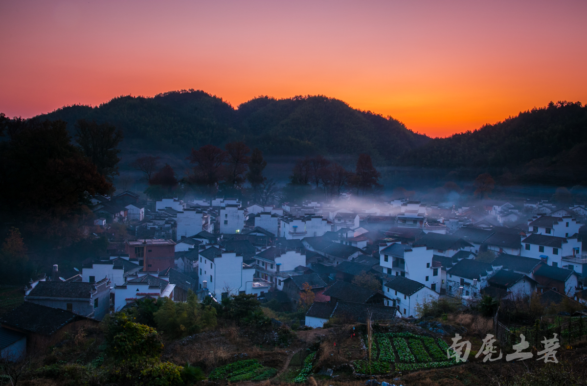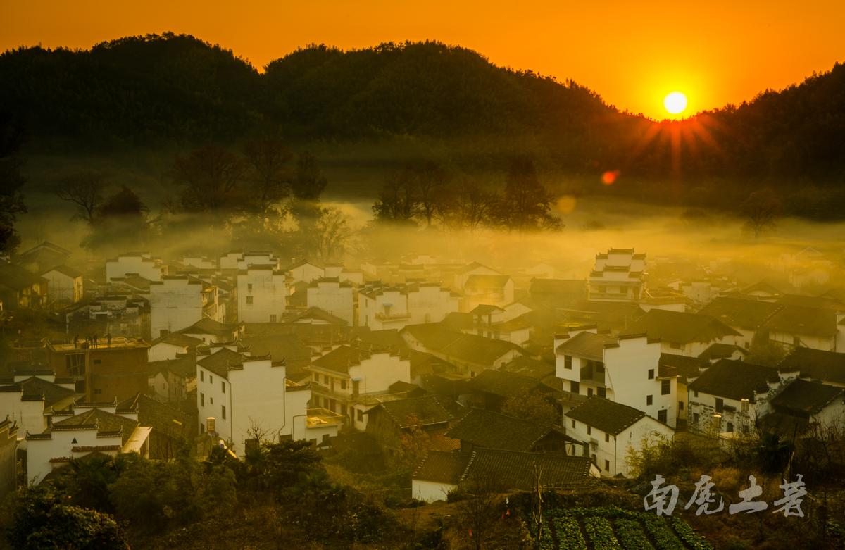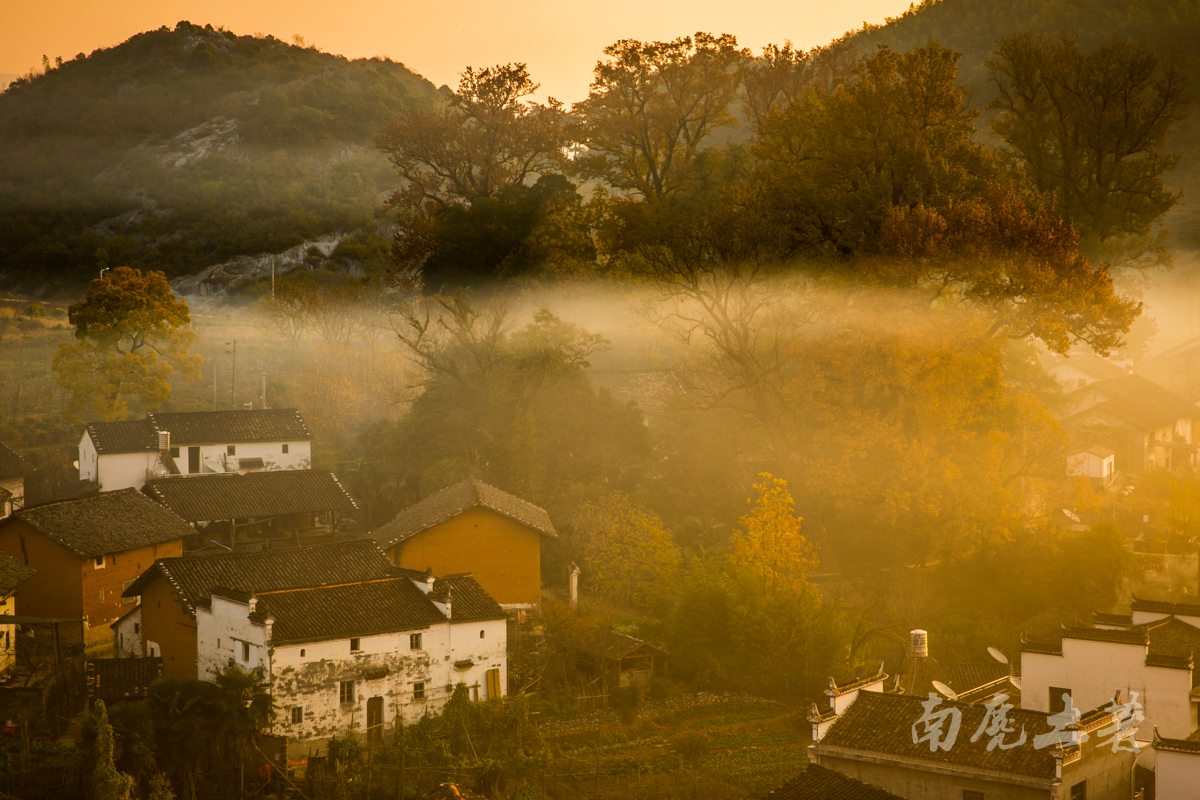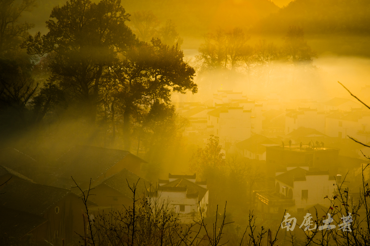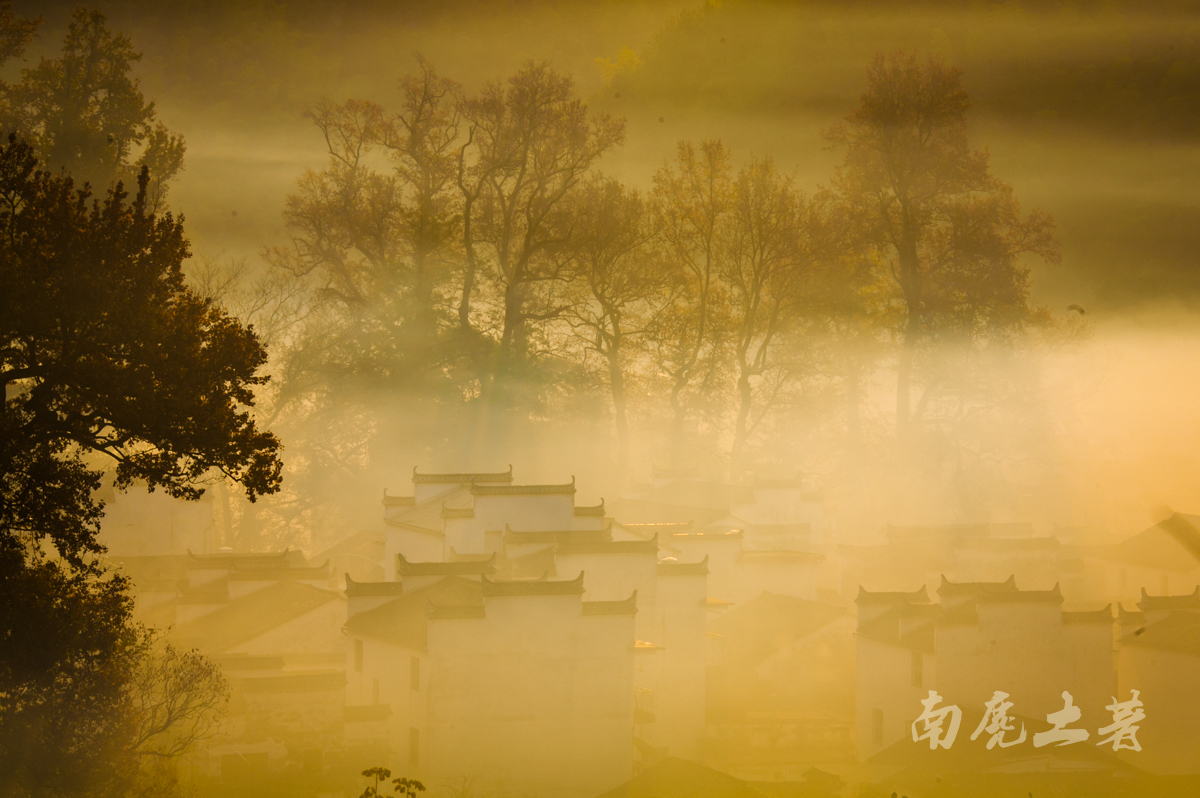 太陽從對(duì)面的山坳里探出頭來,挑明了云霧的層次。此時(shí),整個(gè)程村被薄薄霧氣籠罩著,有趣的是,霧嵐在山腰間流動(dòng),不升高,久久不愿散去。白墻黛瓦的徽派民居若隱若現(xiàn),宛若天上人間。