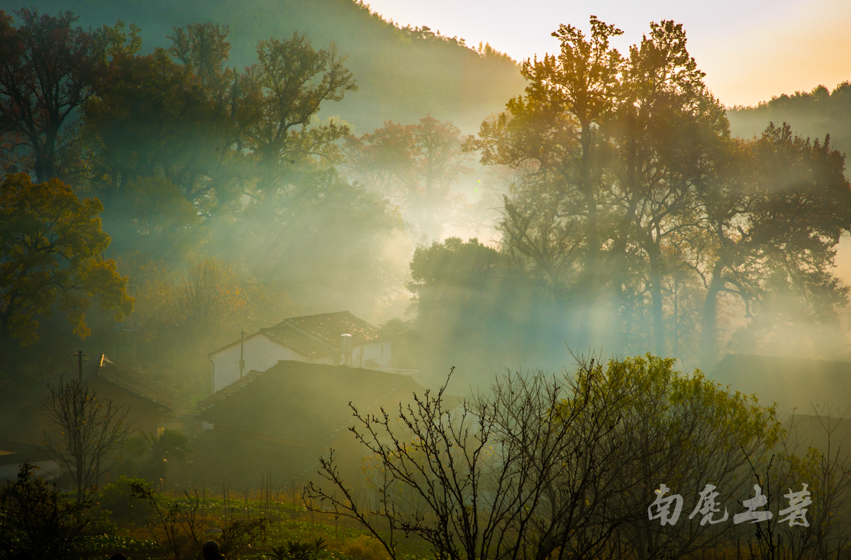 從石山上下來,沿著小徑進(jìn)入程村,光線隨腳步變幻,恍入夢(mèng)境,三面古楓樹環(huán)抱,早晨的霧氣懸掛在樹半腰,此時(shí)炊煙也開始升起,油茶殼開始燃放,幾棟紅墻黛瓦的建筑,印襯在交錯(cuò)相依的白墻間,若隱若現(xiàn),古老的山村像早起老人的安詳表情。