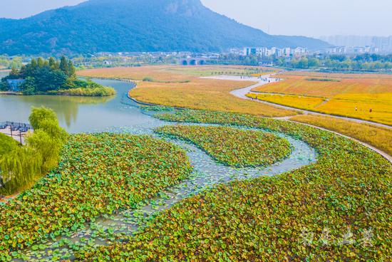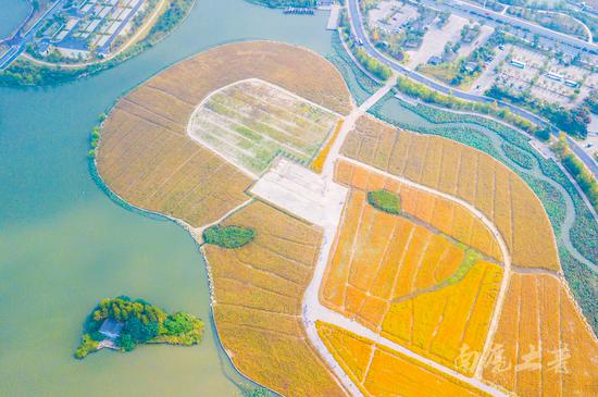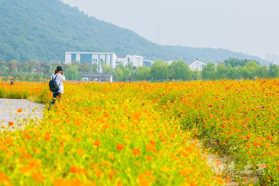 南六路的北邊是湘湖旅游度假區(qū)管理局,南邊的花海按品種分成一道道流暢的線條,俯瞰像重彩的畫,翻滾的波浪。