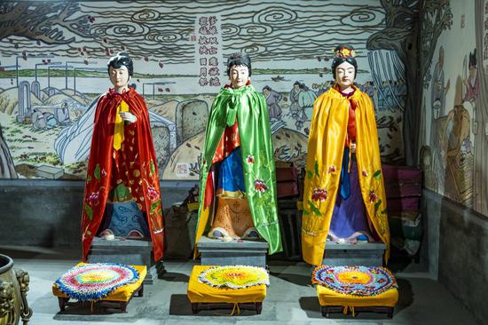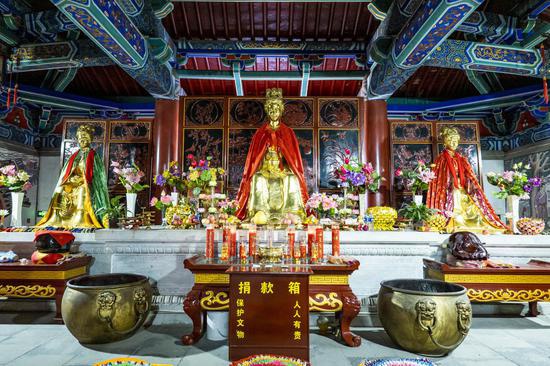 大殿里供奉著圣姑金像。據(jù)傳,在圣姑之后,安平境內(nèi)又先后出了兩位品端孝賢的女子,后人贊其為二姑、三姑,同樣受人敬仰。因此,在孝感圣姑殿內(nèi)共塑三尊鑄銅鎏金像。