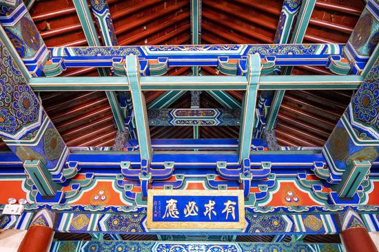 整個正殿系于前后二殿之間,以柱廊連接,成為工字形。上部梁架,因為平面采取工字形的關系,結構比較復雜。全廟利用天然木材不加斫削的榫卯建筑風格在古代建筑史上是一個奇觀,著名學者、建筑大師梁思曾來到這里,給予了很高的評價,并繪制成圖,這也為日后的復建提供了寶貴的工程圖。