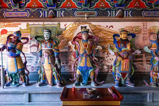 初入圣姑殿內(nèi),兩側(cè)有許多神仙塑像,雖然都叫不上名字,不過都穿著華麗,有的端坐,有的站立,有的穿著鎧甲十分威武,有的華衣寬袖文質(zhì)彬彬。而兩側(cè)的墻壁上就是彩色的壁畫,描繪的是圣姑“吮瘡救父”和“智救劉秀”的傳說。