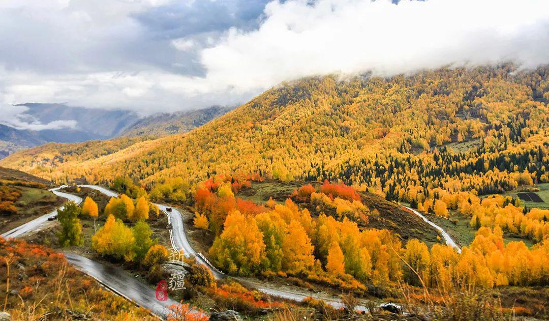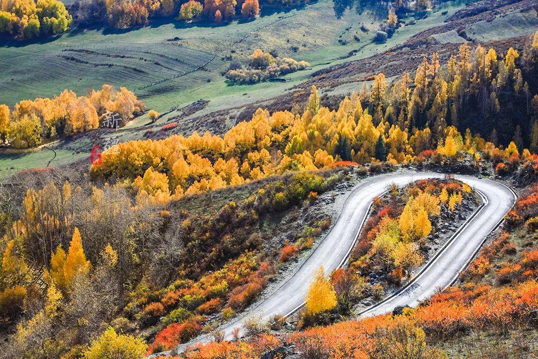 從高處遠(yuǎn)望,群山就像披上了一層金色的大衣,質(zhì)感毛茸茸的。窄窄的車道,宛如一條銀色的絲帶彎曲鑲嵌其中,大概路過(guò)這里的人也會(huì)不由自主放慢車速,一享這迷人秋色吧。