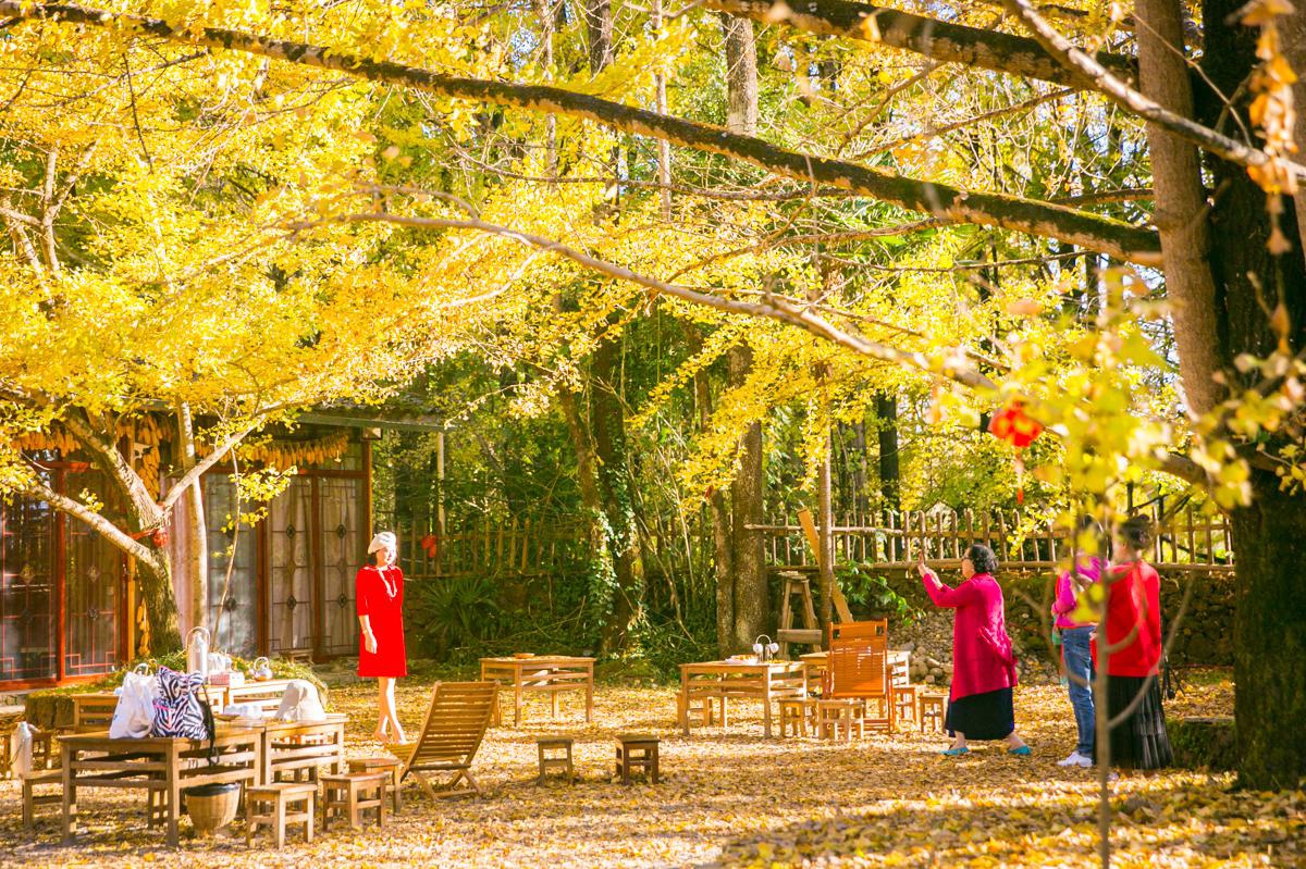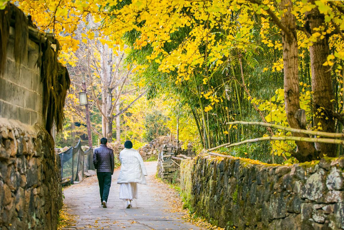村子的外圍游客少,這里不僅有古老的銀杏,還有早年搭建的農(nóng)舍宅院,石頭的護(hù)欄長(zhǎng)滿青苔,曲折的小徑通往山腳或是田頭,自然古樸,早晨聞著雞鳴,慢慢地走過(guò)黃葉飄零的林蔭,非常有意境。