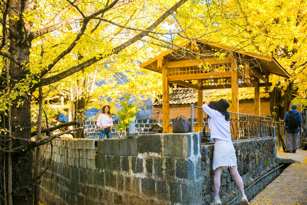 史料記載,元朝初年騰沖設(shè)府,固?hào)|曾設(shè)順江州,當(dāng)時(shí)騰沖屯田已初具規(guī)模,明朝初年,騰沖軍民指揮使司成立以后,騰沖軍屯得到了大力發(fā)展,大批的中原軍人來(lái)到這個(gè)邊疆駐守,筑城、屯田,軍屯得到大力發(fā)展。在當(dāng)?shù)爻杉伊I(yè)后,他們知道再也不可能回到老家去了,于是托老鄉(xiāng)從中原帶來(lái)銀杏種子在飯前屋后栽培,待銀杏樹(shù)長(zhǎng)大,看見(jiàn)銀杏葉就看到了老家,以此來(lái)緩解思鄉(xiāng)之情。從此,銀杏種子就在此生根發(fā)芽,并延續(xù)幾百年,世世代代相傳,久而久之,長(zhǎng)成蒼天大樹(shù),形成了今天的銀杏村。但是今年的銀杏葉隨著氣候的變化,比往年要晚一些。