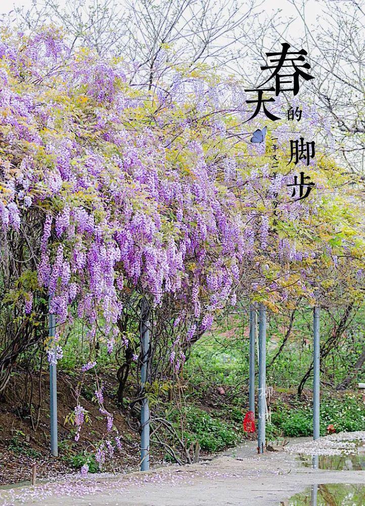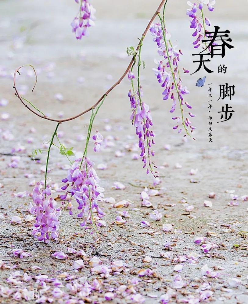忽而一陣風(fēng)過,紫藤花像風(fēng)鈴一般,在風(fēng)中左右擺動(dòng)。還有一些飛舞著、打著旋兒落下,仿若下了一場(chǎng)紛紛擾擾的雨。待到細(xì)看,卻是紫色的花瓣鋪了一地,你都不忍心踩上去。
