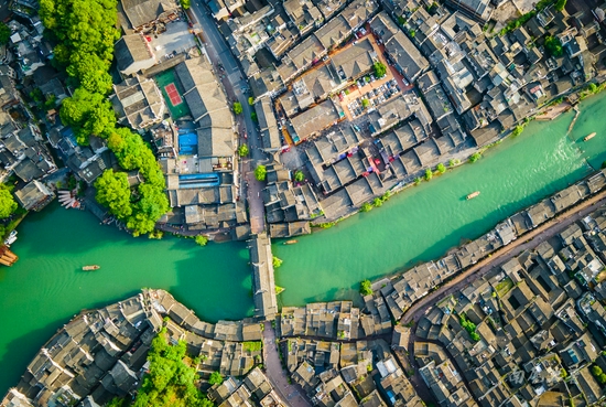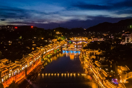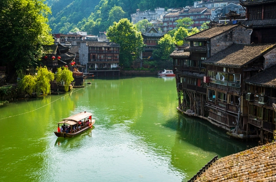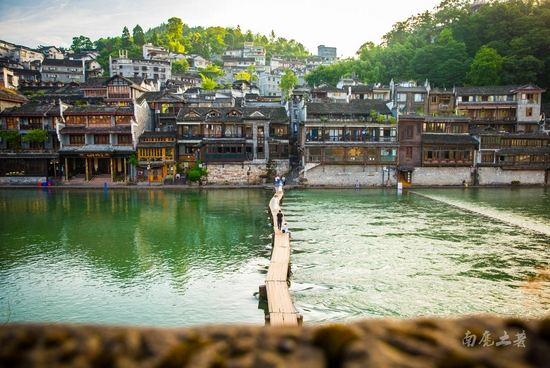 沱江是古城鳳凰的母親河,碧綠的江水穿城而過(guò),勾勒出溫婉的曲線,沿江而建的百年吊腳樓錯(cuò)落成一片古樸的城郭,順?biāo)?,穿過(guò)虹橋是萬(wàn)壽宮、萬(wàn)名塔、奪翠樓,一幅韻味濃郁的古畫(huà)廊。