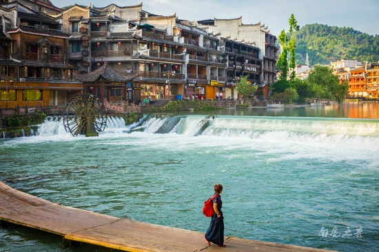 從北門(mén)“壁輝樓”下來(lái),是沱江的游船碼頭,江水從上一個(gè)壩子下來(lái),形成一個(gè)小瀑布,繞著古城日夜不息,和煦的陽(yáng)光下藍(lán)中帶綠,幾個(gè)旅人從跨江的木棧道走過(guò),沐著清風(fēng),輕盈的腳步悄悄喚醒鳳凰古城新的一天。