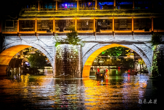 右邊的虹橋始建于明朝洪武年間,距今有600多年的歷史,因建橋時(shí)所用巖石為朱紅色砂石,建好后宛如彩虹臥江,起名為虹橋。夜晚一艘艘游船順江而下,穿過(guò)光影夢(mèng)幻的橋拱,優(yōu)哉游哉。