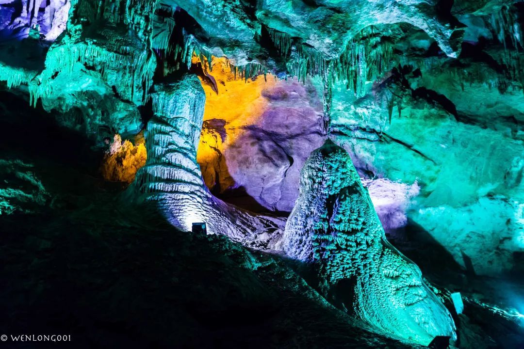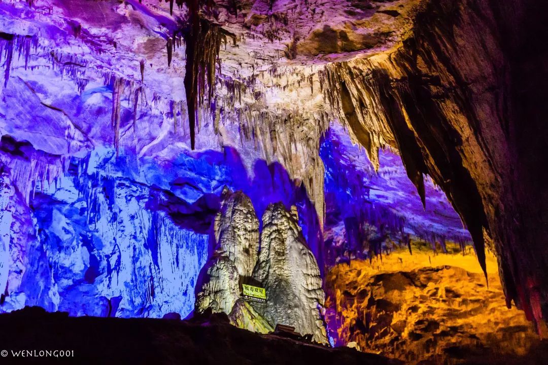 我印象最深的是一處寶鼎雙鐘,我看有的資料也喚作古剎金鐘,它自上而下似連非連,還在滴水中,中間未連接的距離根據現在的水流和鐘乳石形成的速度,經過洞穴專家測算,水洞石筍的生長速率為100年6.76毫米,目前還不到1厘米距離,計算出來大概百年左右就會連接上,所以這里也給來的游客一個關于生命美好的祝愿,就是相約百年后來這里看到這里連接形成。