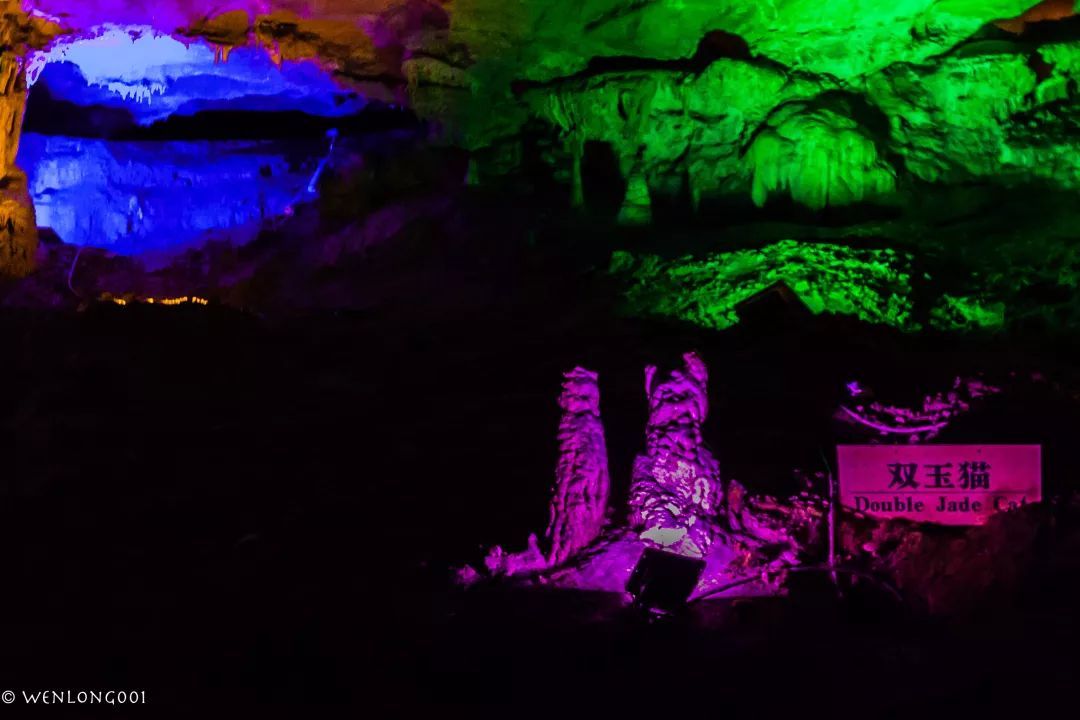 經過億萬年的時光造就,這里形成了許多極其逼真,活靈活現的景物,比如“雙玉貓”,兩根鐘乳石挨在一起很像兩只貓咪,根據角度的不同又像不同類的貓,比如左側的有些像hello kitty,右側的有些像招財貓。