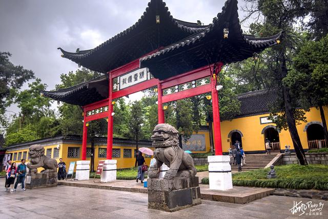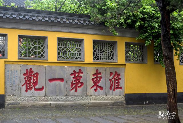 揚(yáng)州大明寺門向南,門前建有一座古樸的牌樓,四柱三檐,斗拱托頂,仰如華蓋。青瓦朱柱,翹角飛檐。上方正中篆書(shū)“棲靈遺址”四字額,為民國(guó)初年鹽運(yùn)使姚煜手書(shū)。寺門兩序墻八字向,左序東折墻壁上嵌雍正年間石刻“淮東第一觀”五大字,書(shū)法由金壇蔣衡(湘帆)書(shū)寫(xiě)。右序西折墻壁上嵌石刻“天下第五泉”五大字,據(jù)唐代張又新《煎茶水記》中引用劉伯芻的話,將國(guó)內(nèi)最宜煎茶的七處著名水源評(píng)定等次,列大明寺泉為第五,故有此刻。