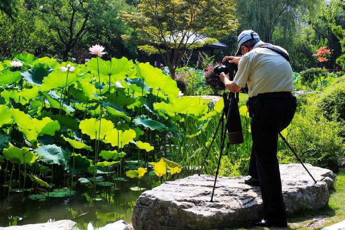 七月十五日上午七點從家里出發(fā),趕到上海莘莊公園,參加色友攝影愛好采風(fēng)團(tuán)組織的拍攝荷花活動。荷花池就在梅園里面,兩池中以一水澗相連,澗上有橋。水域面積大,但更有私家園林的別致精巧。兩個池中植有荷花,池四周種植黃馨、木香、紫藤等,池旁黑松林立,林中有一石亭名華亭,夏日里,滿池荷花盛開,各色的荷花在綠葉的襯托下,顯得婀娜多姿,楚楚動人,風(fēng)情萬種,觀賞者坐在樹蔭下和華亭內(nèi)悠然自得,賞心悅目。