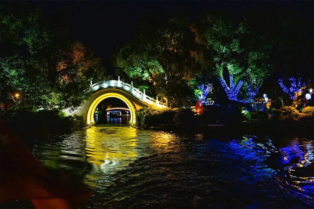 既然是環(huán)城水系,那么橋肯定是必不可少的。游船的途中,還會(huì)經(jīng)過許多橋梁。這些橋風(fēng)格、造型各不相同,白日里很容易讓人忽略,現(xiàn)在卻嘆為觀止。
